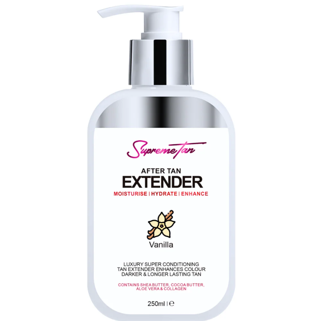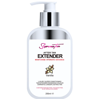 Supreme Tan After Tan Extender is a deeply hydrating lotion formulated with shea butter, aloe, carrot oil, and tyrosine to prolong and deepen your tan. With added collagen, vitamin E, and tomato extract, it boosts elasticity, repairs skin, and supports melanin. A vanilla scent enhances the experience. Use daily after tanning for smooth, nourished skin and lasting color.