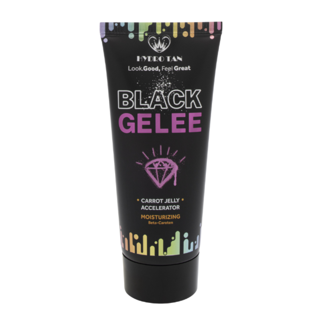 Hydrotan Black Gelee is a bronzer-free tanning accelerator with a melanogenesis complex to deepen and prolong natural tanning. Featuring beta-carotene, carrot oil, cacao, and L-tyrosine, it provides immediate pigmentation and antioxidant support. Firming and tattoo-enhancing complexes help smooth skin and boost ink vibrancy. For sunbed use only; not a sunscreen.